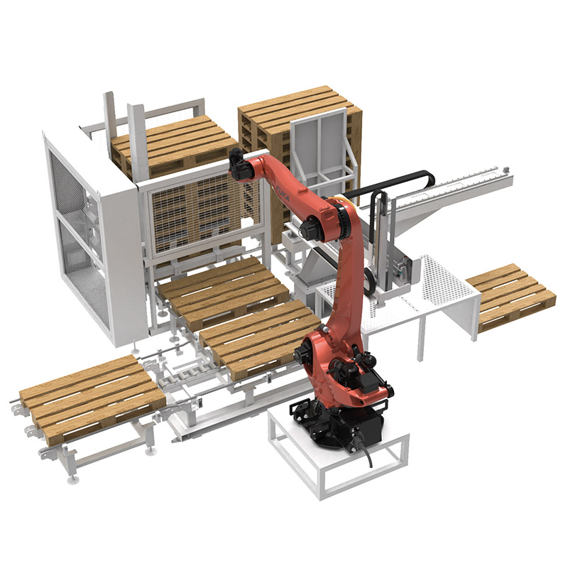 The robotic palletizer adopts a programmable robotic arm structure and equipped with an automatic pallet feeding device, it can seamlessly connect with case packers, wrapping machines and other equipment to automatically grab, transport and palletize materials (cartons, pallets, grouped products, etc.). With stable and accurate operation, it is compatible with various specifications of materials, which can greatly replace manual labor, improve palletizing efficiency, reduce material loss, and ensure the neatness of palletizing.